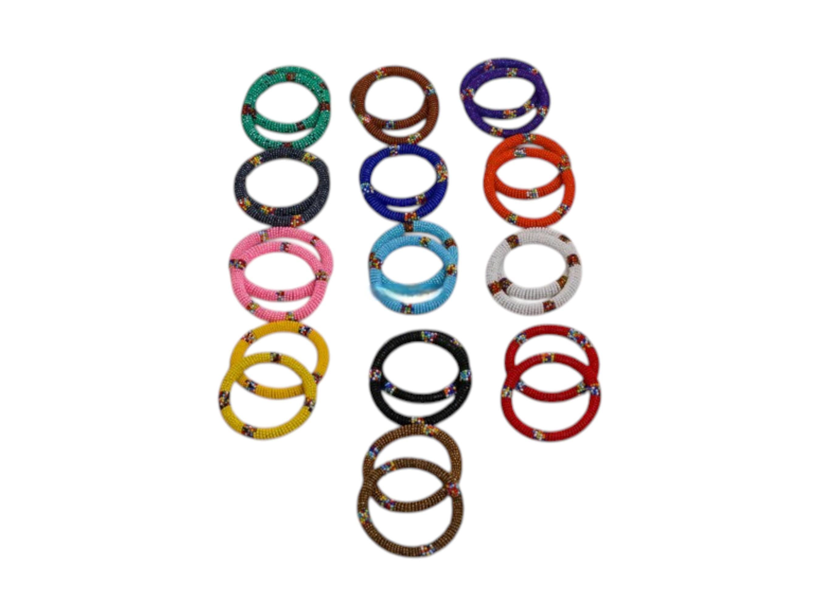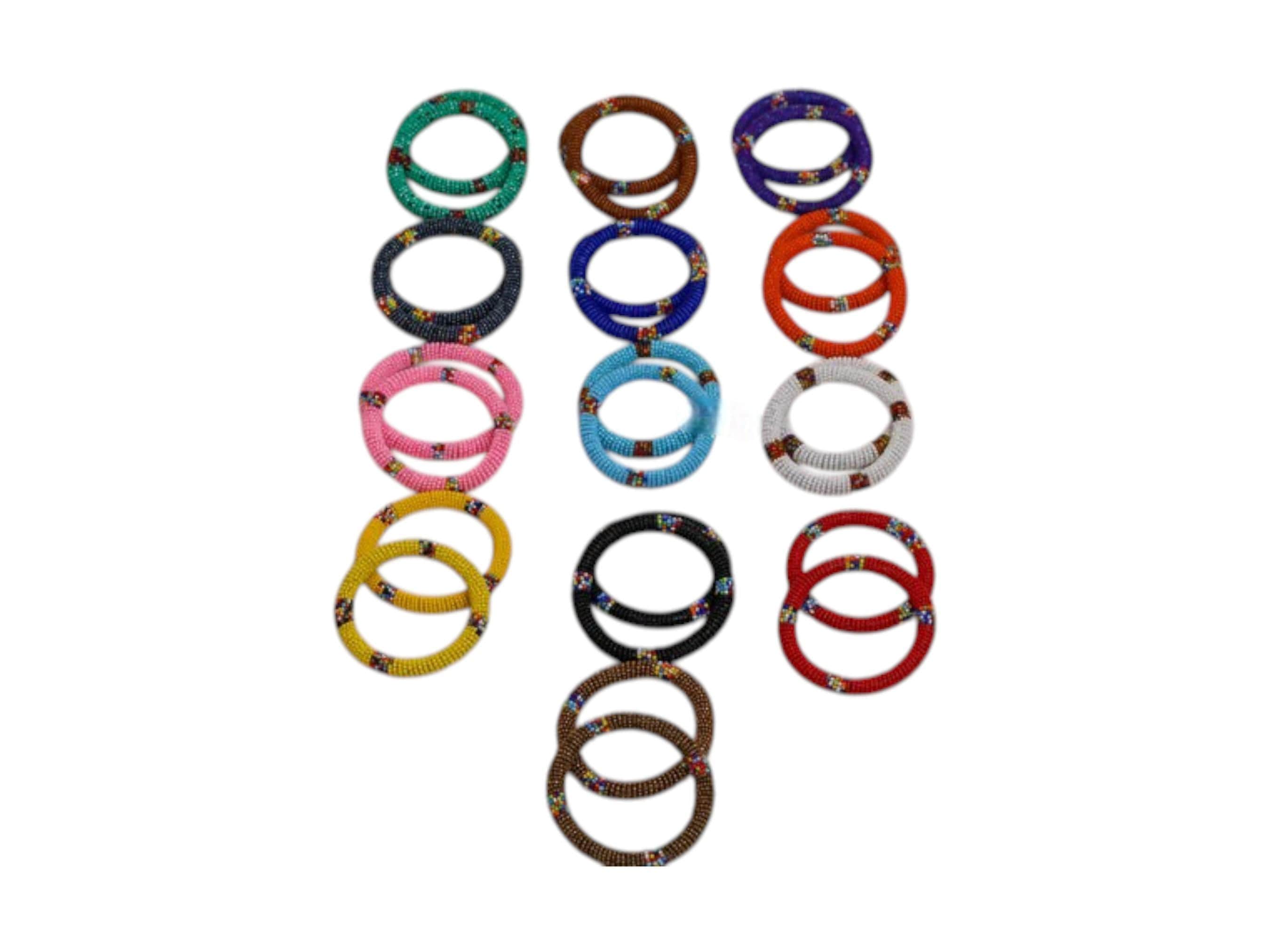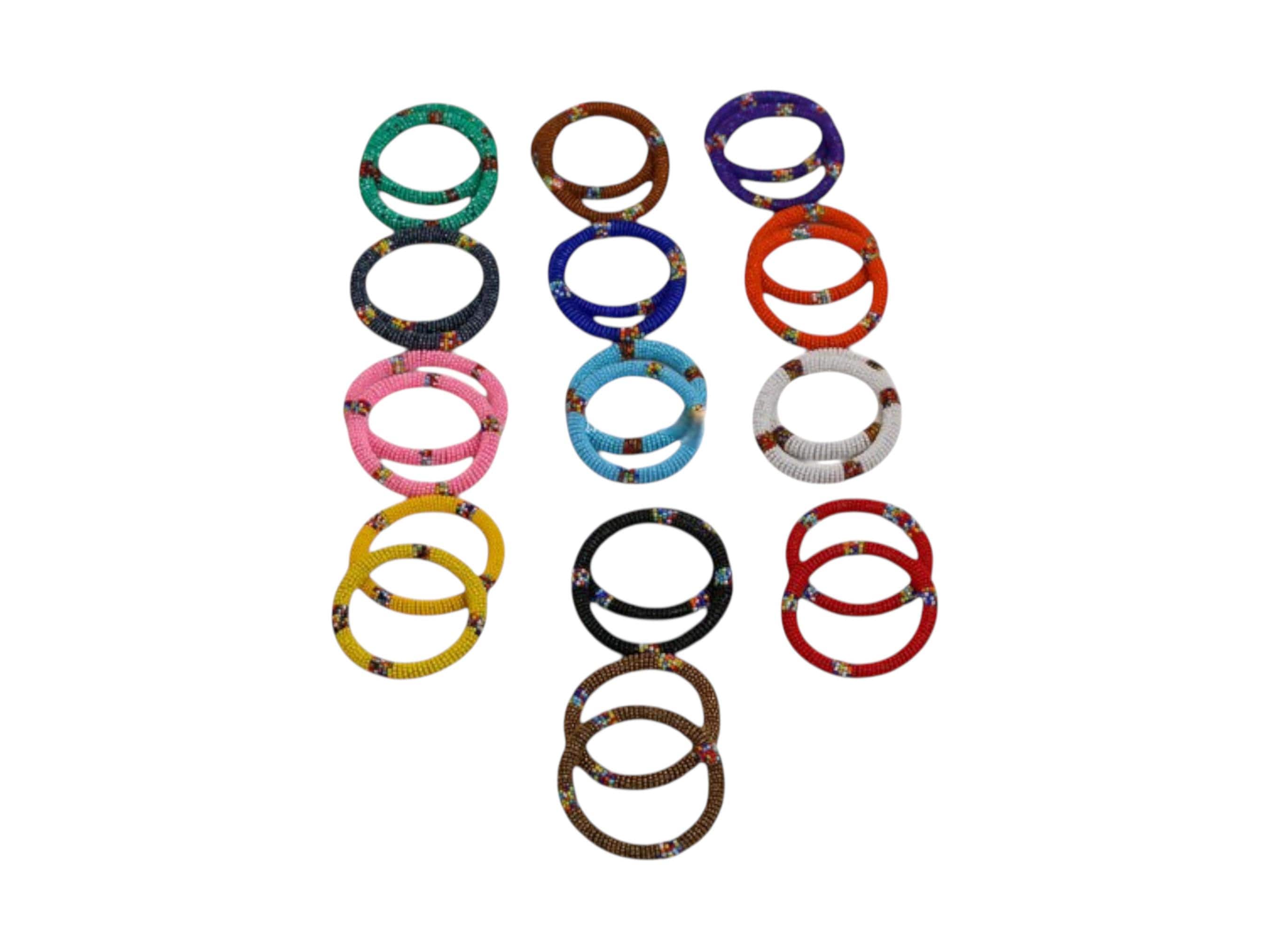 Celebrate artisan craftsmanship with this extensive bulk set of 11 Maasai beaded bangle pairs. The collection contains twenty-two individual bracelets in a complete rainbow of colors. Each pair is hand-beaded with a vibrant base color and small, multi-colored geometric accents. Featured hues range from classic black and white to bright pink, yellow, and royal blue. These slim hoops are meticulously crafted using traditional African beadwork techniques. The lightweight design makes them comfortable for all-day wear and ideal for stacking. High-quality glass seed beads ensure a professional and durable finish on every piece. This variety pack is perfect for gifting, party favors, or building a boho jewelry collection.