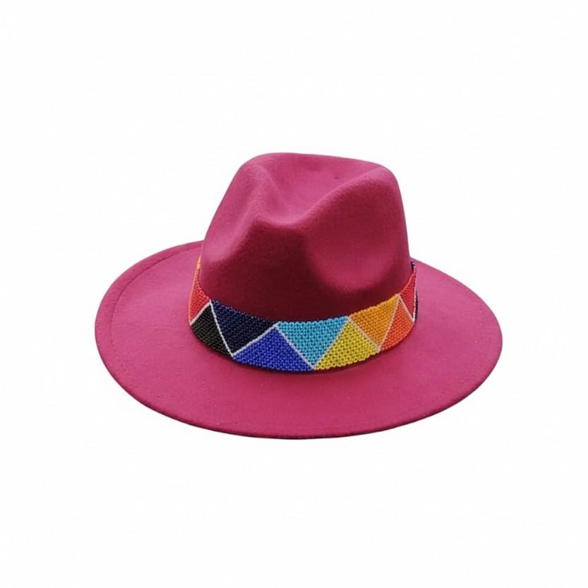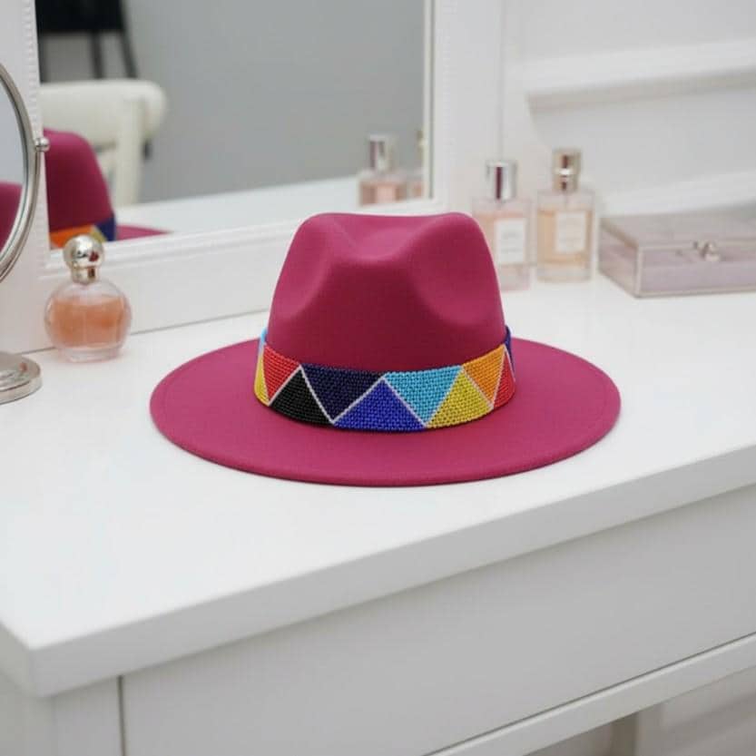 Make a bold statement with this vibrant magenta wool fedora hat. Crafted from felted wool, it features a wide, eye-catching beaded hatband with a colorful geometric triangle pattern in blue, yellow, orange, red, and black. This unique hat is the perfect accessory for festivals, concerts, summer parties, or adding a bohemian pop of color to any outfit. Stand out from the crowd with this stunning piece – add it to your cart today!