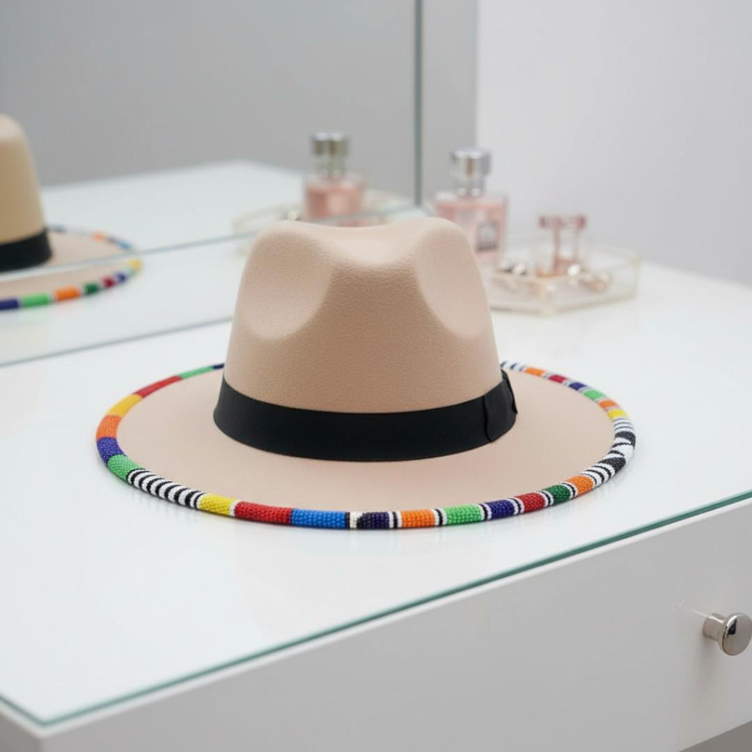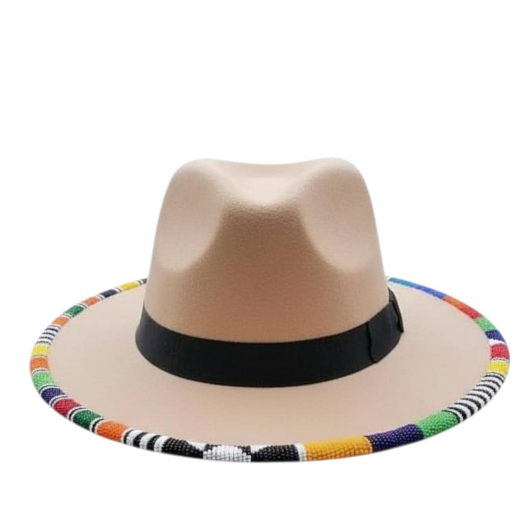 Embrace effortless elegance with this sophisticated beige wool fedora, uniquely accented with a vibrant hand-beaded brim. The neutral sand-toned felt provides a perfect canvas for the intricate, multi-colored tribal beadwork that circles the edge, while a sleek black ribbon band adds a touch of classic contrast. This hat is the ultimate accessory for the modern wanderer, designed for music festivals, sun-drenched beach days, or stylish city strolls. Its wide brim offers excellent sun protection without sacrificing your bohemian flair, making it a versatile statement piece for any season. Handcrafted with attention to detail, this hat is more than just an accessory—it's a work of art that reflects a love for global culture and high fashion. Secure this one-of-a-kind piece and elevate your signature style today!