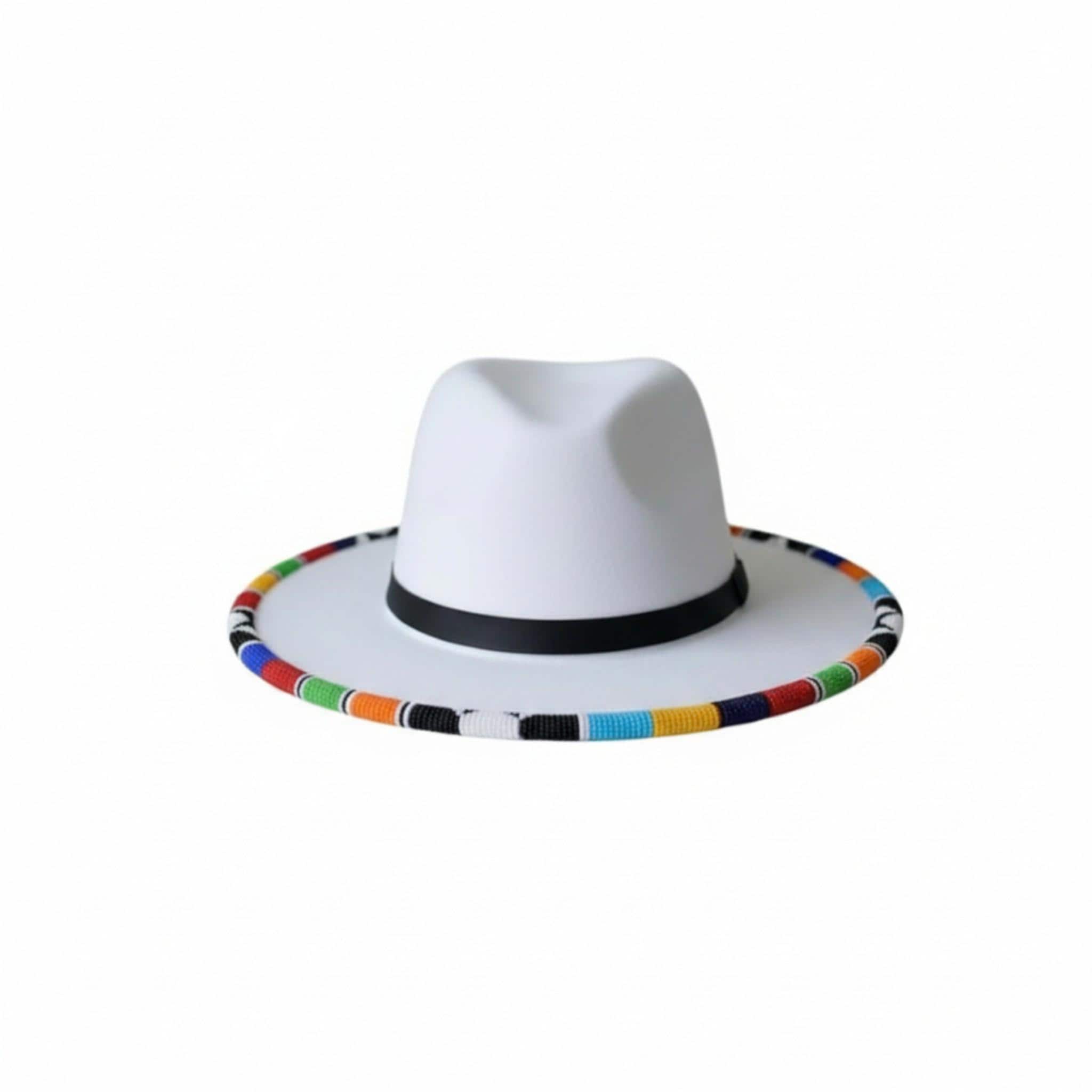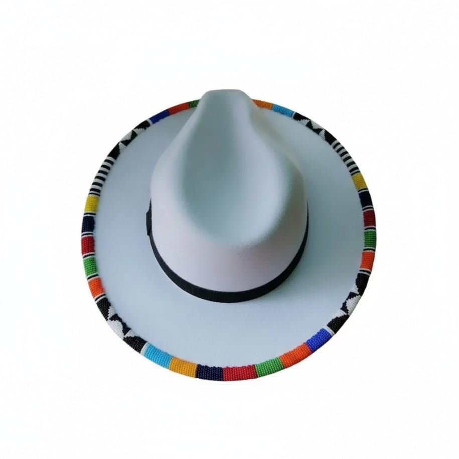 Step into the spotlight with this elegant white wool fedora, beautifully accented by a vibrant, multi-colored hand-beaded brim. This hat combines the clean, classic look of white felt with the rich textures of traditional African beadwork, creating a piece that is both sophisticated and spirited. Whether you are attending a boho-chic wedding, dancing at a summer music festival, or exploring a new city, this wide-brim hat provides the perfect finishing touch to any outfit while offering stylish sun protection.