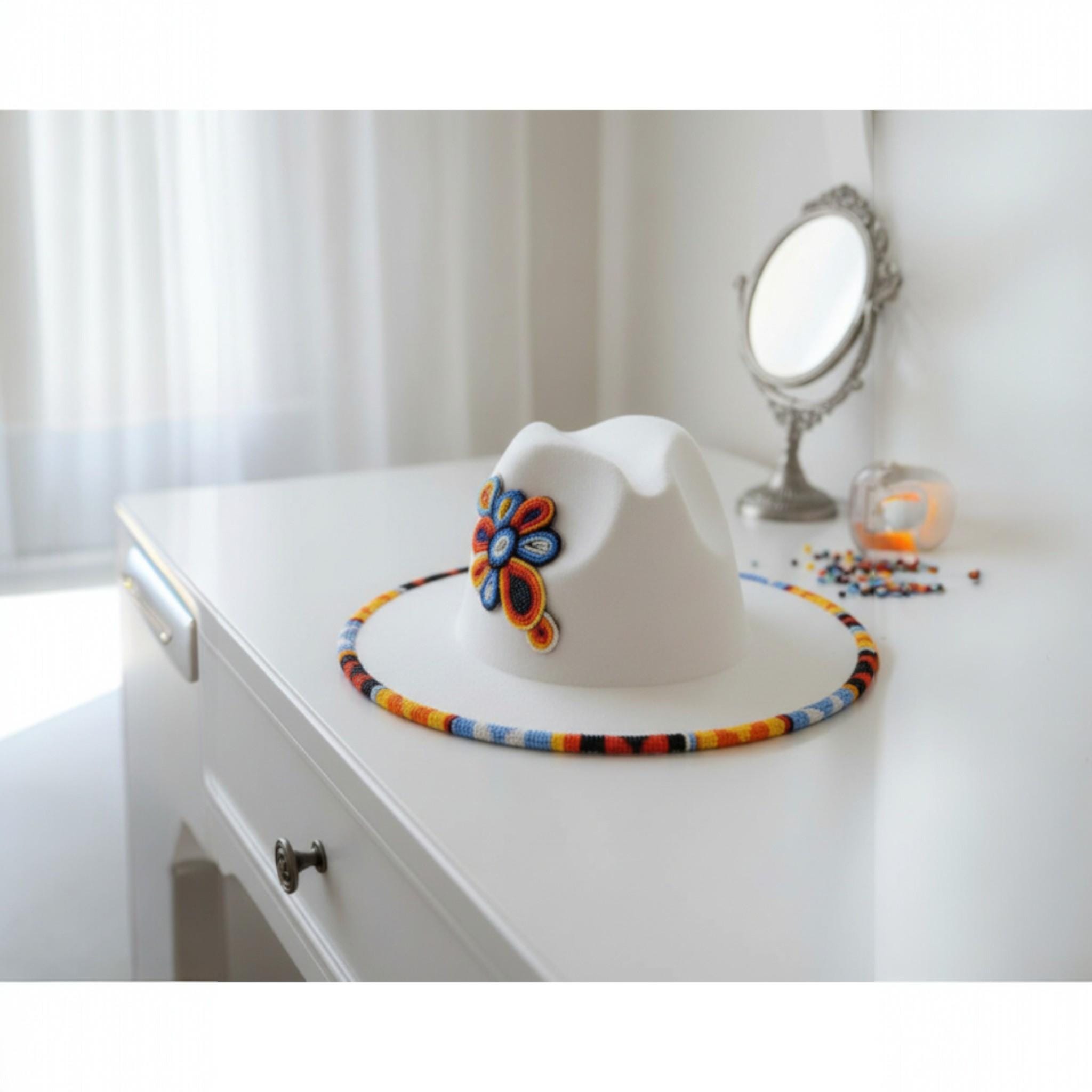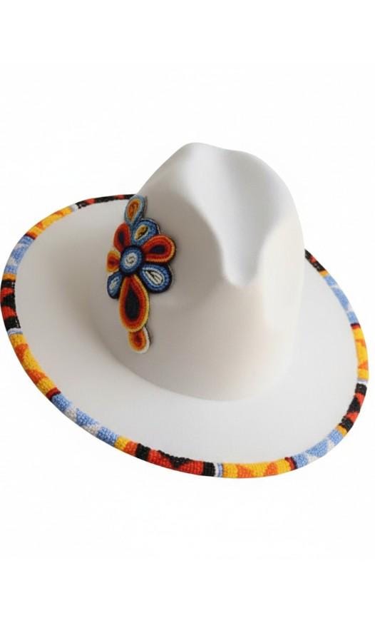 Elevate your accessory collection with this extraordinary white wool fedora, a true celebration of handcrafted artistry. This hat features not only a vibrant, hand-beaded brim but also a stunning, oversized beaded floral patch on the side of the crown, showcasing a kaleidoscope of rich colors and intricate geometric patterns.