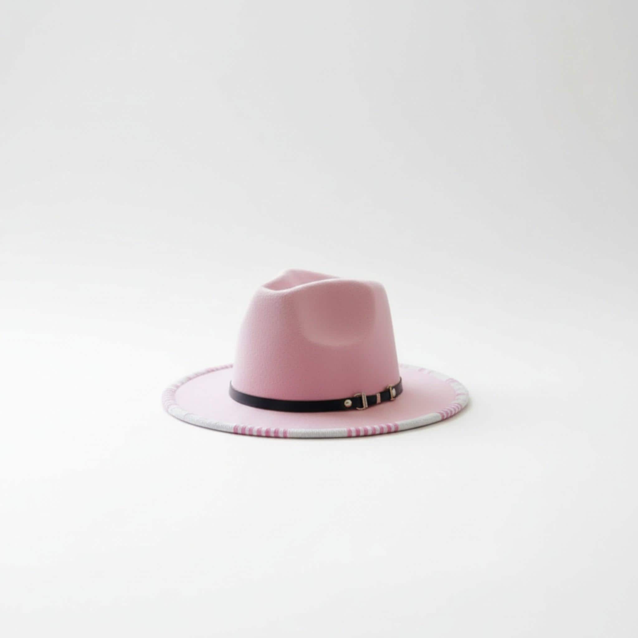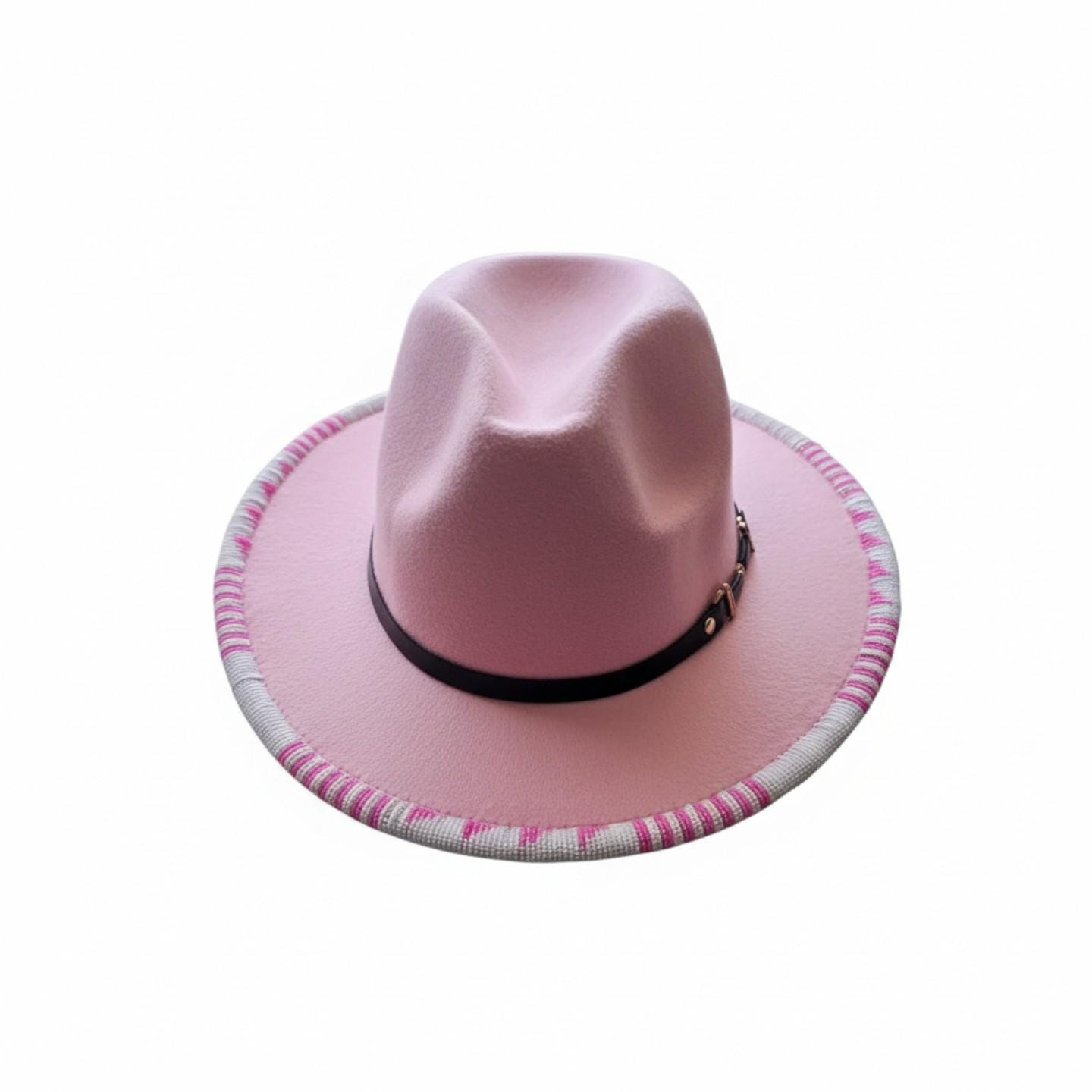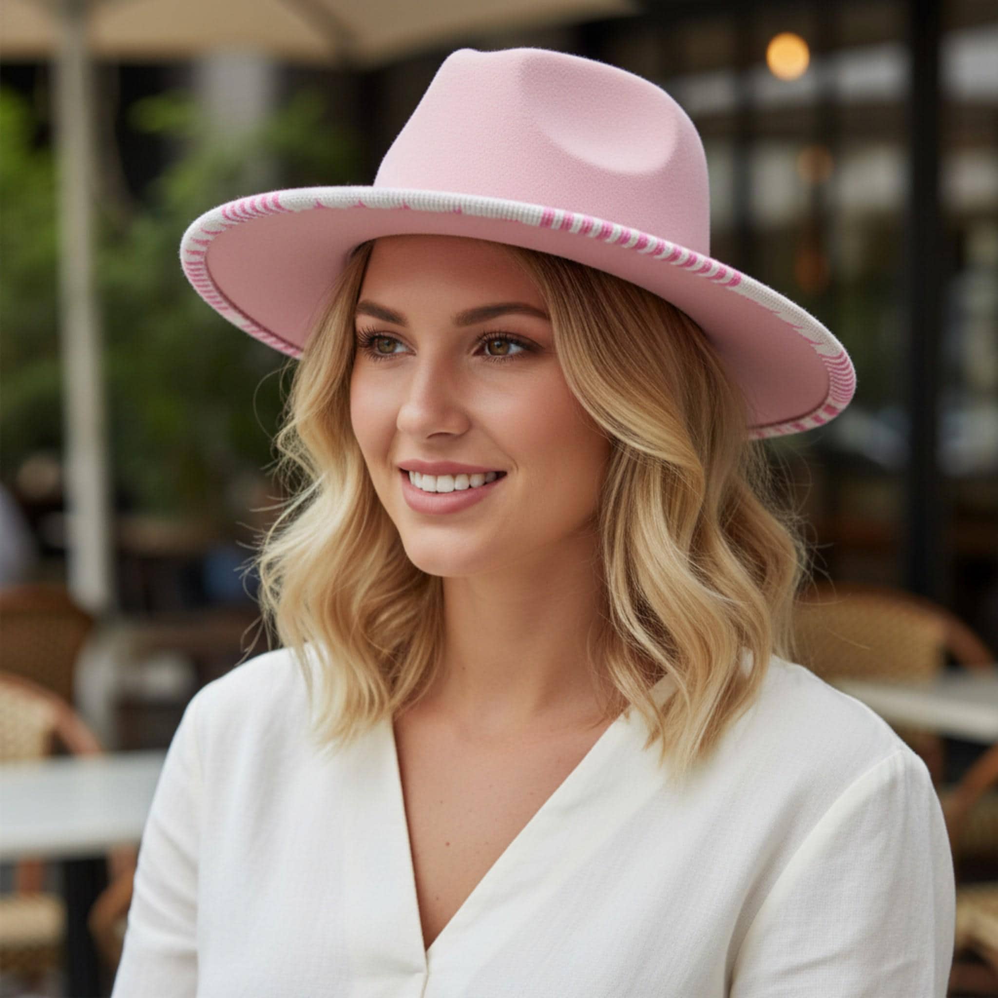 Add a touch of soft elegance to your wardrobe with this stunning light pink wool fedora. Crafted from high-quality felt, this hat features a sophisticated black leather-style band and a uniquely detailed pink and white patterned trim along the brim's edge.