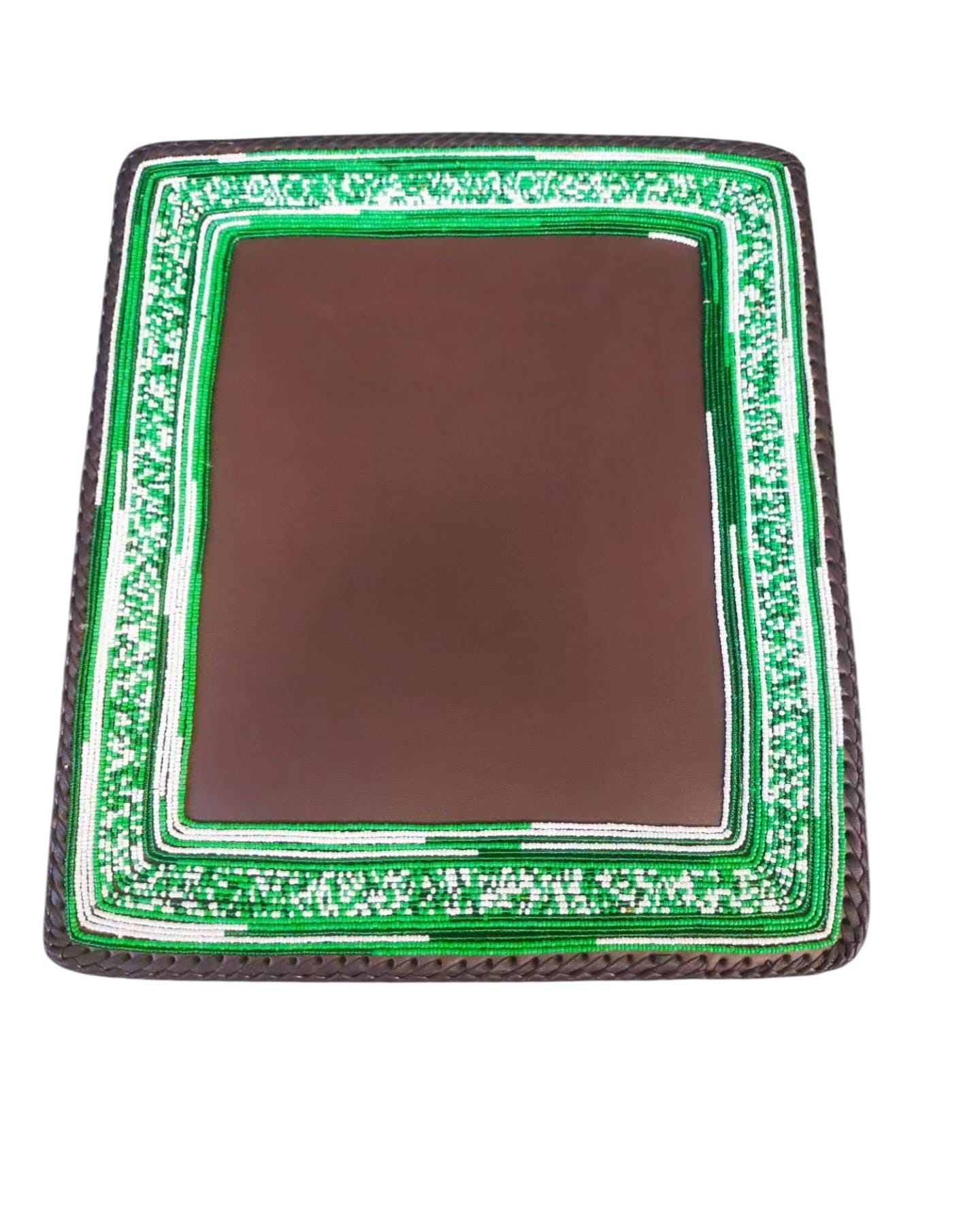 This magnificent rectangular placemat is a stunning fusion of traditional African artistry and functional design. Expertly handcrafted, it features a premium, rich brown leather center bordered by intricate Maasai-inspired beadwork in a vibrant green and white geometric pattern. The edges are finished with a sophisticated braided leather trim, ensuring both durability and a polished aesthetic. Beyond its beauty, this placemat serves as a protective and heat-resistant barrier for your dining surfaces, bringing an authentic ethnic flair to your home decor or special event table settings. Elevate your dining experience and celebrate artisan craftsmanship by adding this exquisite piece to your collection today.