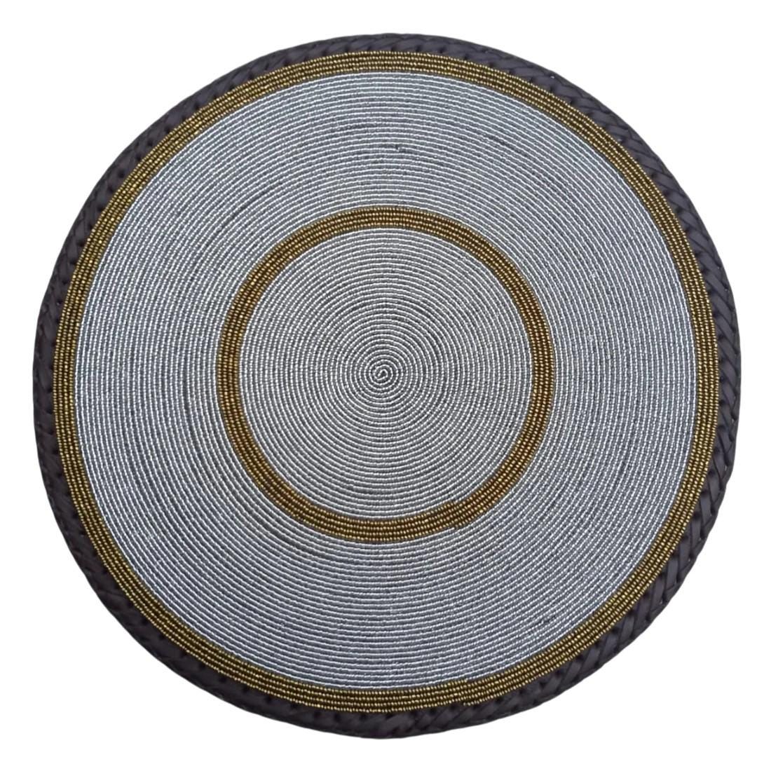 Add a touch of radiant elegance to your dining table with this stunning handmade silver and gold beaded placemat. Each mat is intricately hand-woven in a hypnotic spiral pattern using premium metallic seed beads that catch the light beautifully. The sophisticated combination of shimmering silver with gold accents creates a versatile look that complements both modern and traditional tableware. Designed with a sturdy braided border, this circular placemat is as durable as it is decorative, protecting your surfaces with style. Whether you are hosting a festive holiday dinner or looking for a daily touch of luxury, this piece elevates any meal into an occasion. It serves as a perfect gift for housewarmings, weddings, or for anyone who loves high-quality, artisan-made home accessories. The heat-resistant beaded surface provides a practical yet glamorous foundation for your favorite plates and centerpieces.