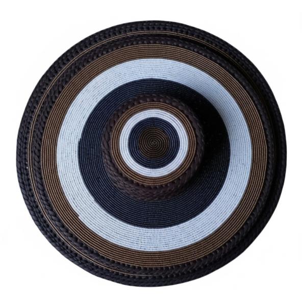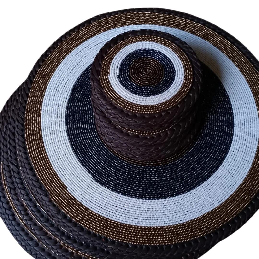 Elevate your home with this striking set of hand-beaded table mats and coordinating coasters, a true masterpiece of traditional craftsmanship. Meticulously handcrafted, each piece features elegant concentric circles of Maasai beadwork in a sophisticated palette of deep black, crisp white, and shimmering copper. The durable leather base is expertly finished with a thick, braided border that provides both structural integrity and a polished aesthetic. These functional pieces of art are designed to protect your surfaces from heat and spills while serving as a bold, cultural centerpiece for your dining room or coffee table. Whether you are hosting an elegant dinner party or looking for a unique housewarming gift, this artisan set brings the authentic spirit of East African artistry into any space. Enhance your decor with this exquisite example of fine African craftsmanship today.
