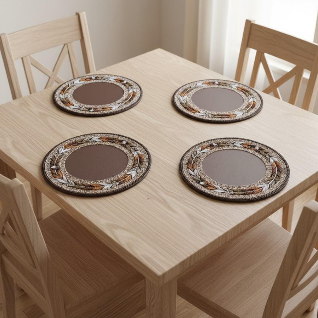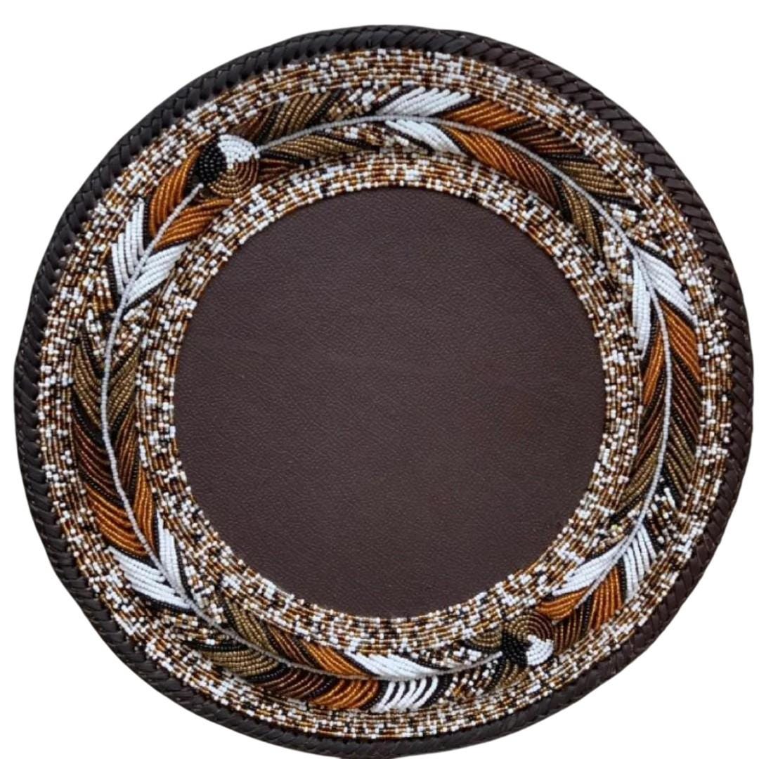 This exquisite circular table mat is a showcase of high-level Maasai craftsmanship. It features a central disc of smooth brown leather surrounded by stunning feather-inspired beadwork in copper, white, and black tones. The edge is meticulously finished with a thick, braided leather trim that adds both durability and a polished, artisanal look. Designed to be both functional and decorative, this mat protects your surfaces from heat while serving as a sophisticated cultural centerpiece for any dining room or coffee table. Perfect for those who value unique, handmade global decor, this piece brings the authentic beauty of Kenyan heritage into your home.